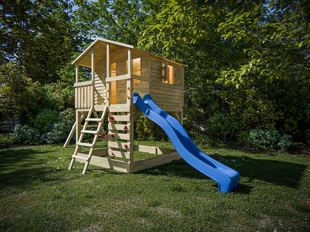 Im Lieferumfang ist eine schräge Leiter für einen sicheren Aufstieg enthalten. Für zusätzlichen Spielspaß ist das Stelzenhaus mit einer Kletterwand und 5 roten Klettersteinen ausgestattet.