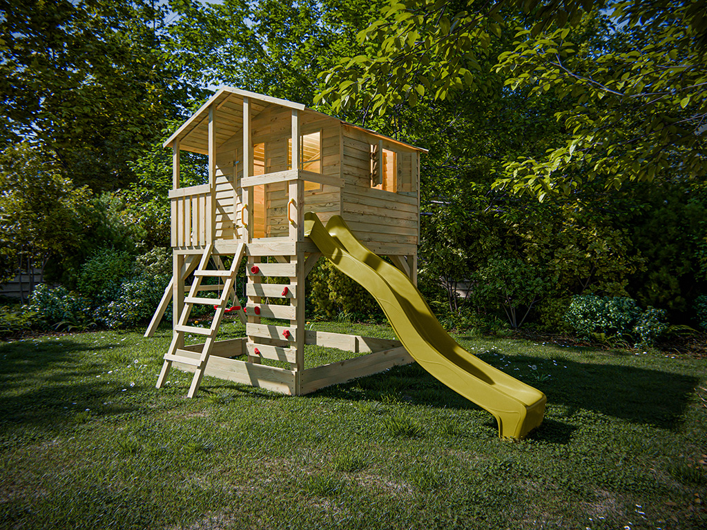 Im Lieferumfang ist eine schräge Leiter für einen sicheren Aufstieg enthalten. Für zusätzlichen Spielspaß ist das Stelzenhaus mit einer Kletterwand und 5 roten Klettersteinen ausgestattet.