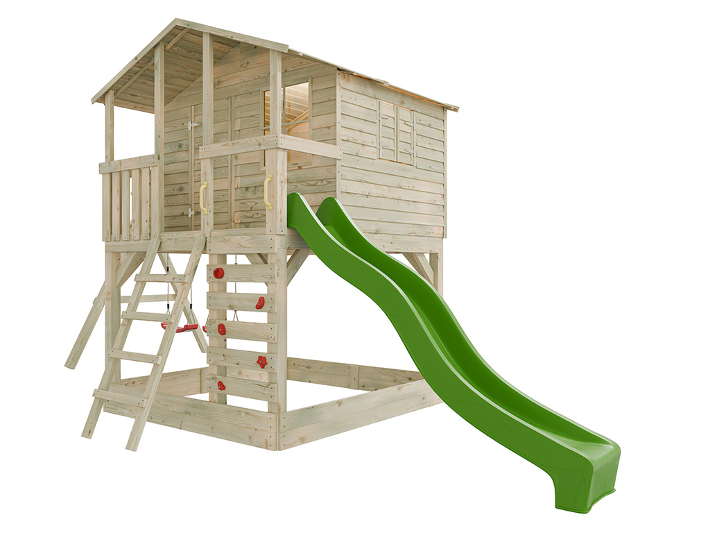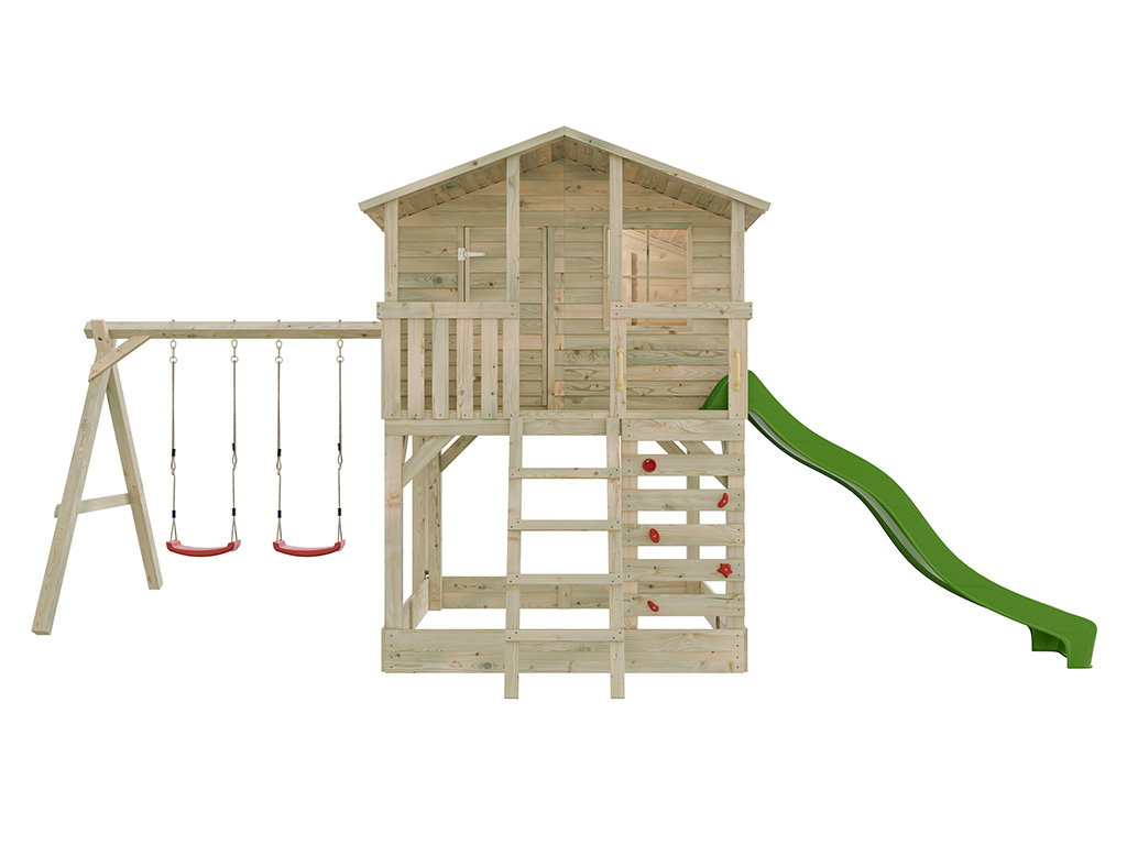 Im Lieferumfang ist eine schräge Leiter für einen sicheren Aufstieg enthalten. Für zusätzlichen Spielspaß ist das Stelzenhaus mit einer Kletterwand und 5 roten Klettersteinen ausgestattet. - Inkl. Doppelschaukel und Rutsche