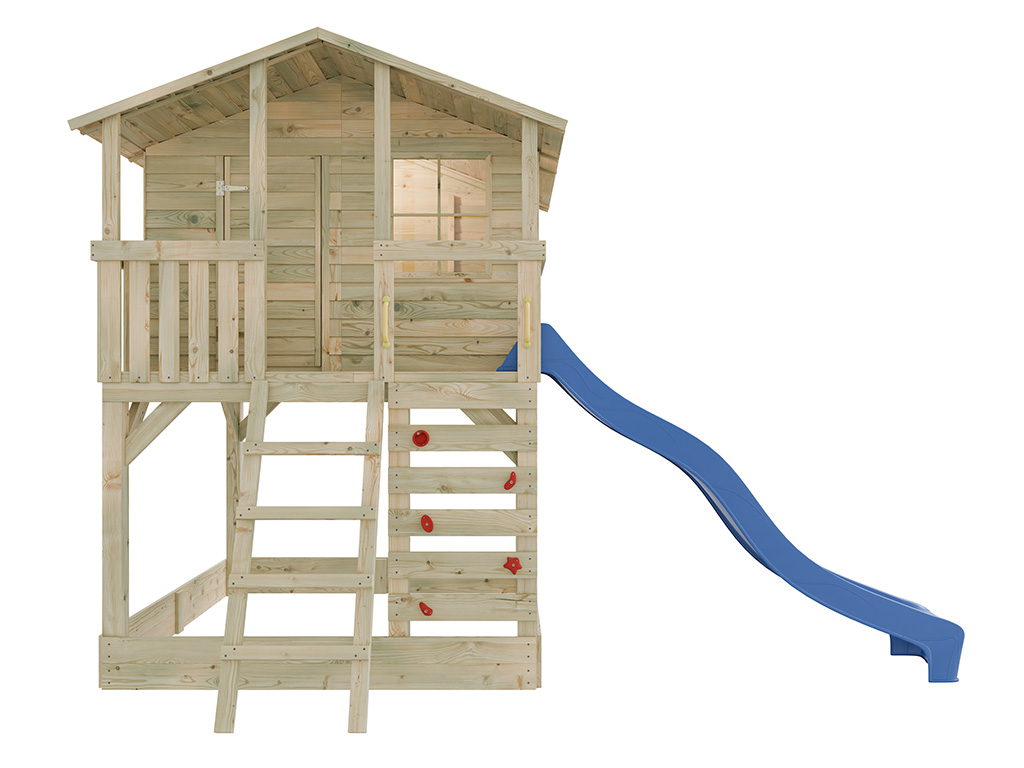 Im Lieferumfang ist eine schräge Leiter für einen sicheren Aufstieg enthalten. Für zusätzlichen Spielspaß ist das Stelzenhaus mit einer Kletterwand und 5 roten Klettersteinen ausgestattet. - Inkl. Rutsche