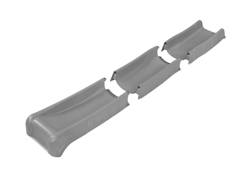 Eine 2,87 Meter lange "rocli" Wellenrutsche ist bereits im Lieferumfang enthalten. Die Rutsche lässt sich mit wenigen Handgriffen in eine Wasserrutsche verwandeln. Hierfür befindet sich an der Unterseite der Rutsche ein Anschluss für den Gartenschlauch, der einmalig mit einem Bohrloch hergestellt werden kann. Die "rocli" Rutsche besteht aus drei Teilen, die zusammengesteckt werden. - Einfacher Aufbau
