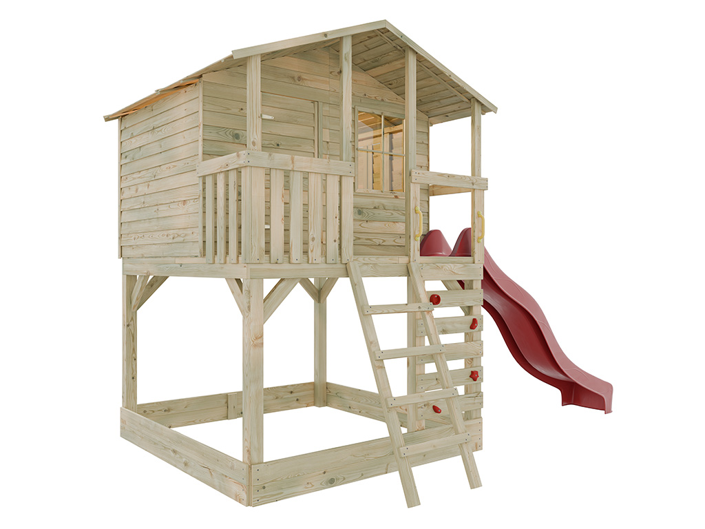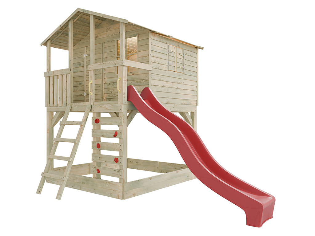 Im Lieferumfang ist eine schräge Leiter für einen sicheren Aufstieg enthalten. Für zusätzlichen Spielspaß ist das Stelzenhaus mit einer Kletterwand und 5 roten Klettersteinen ausgestattet. - Inkl. Rutsche
