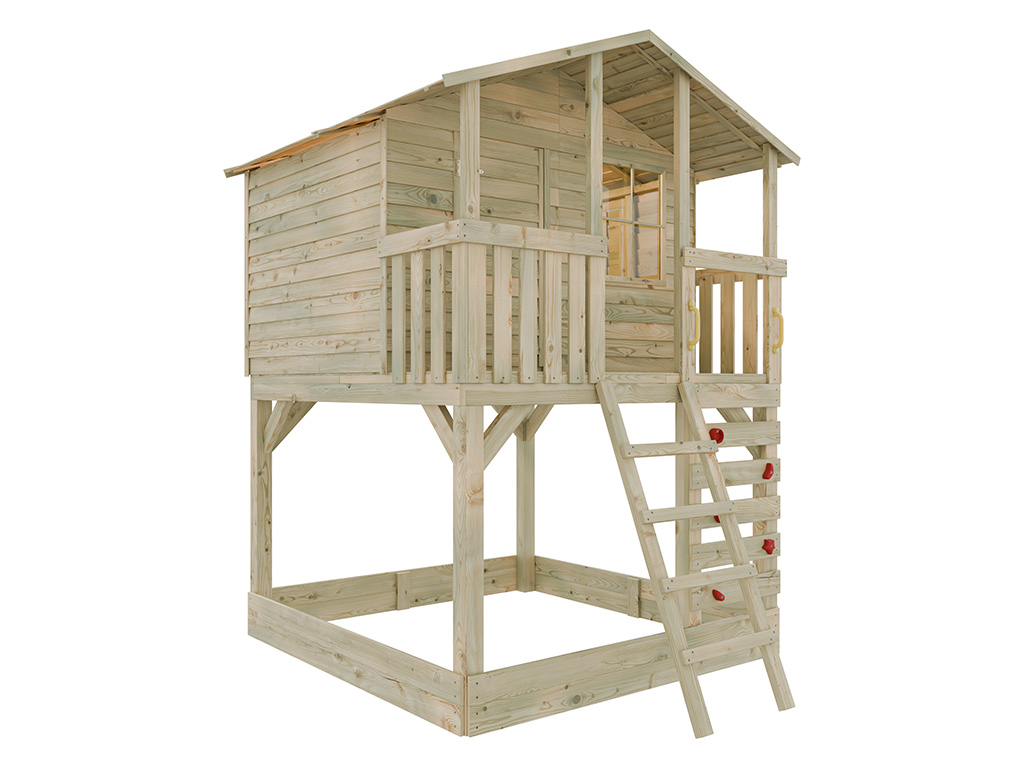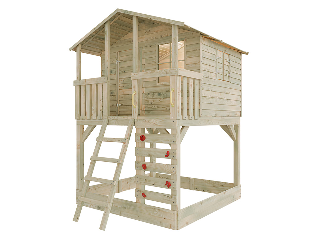 Im Lieferumfang ist eine schräge Leiter für einen sicheren Aufstieg enthalten. Für zusätzlichen Spielspaß ist das Stelzenhaus mit einer Kletterwand und 5 roten Klettersteinen ausgestattet.