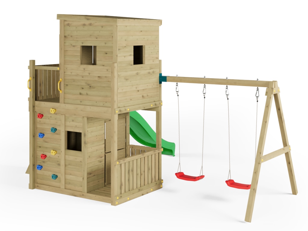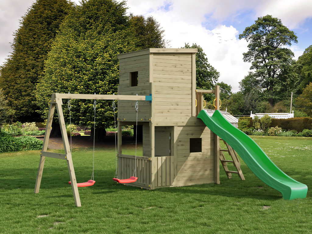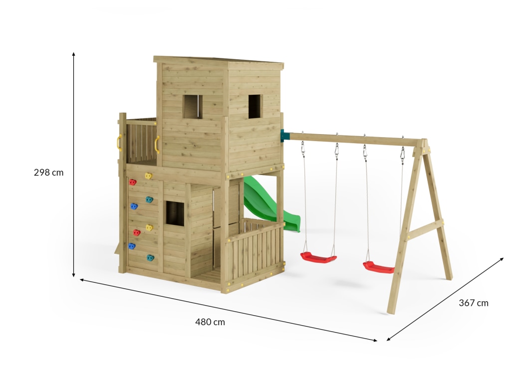 Material: Holz, B x T x H: 480 x 367 x 298 cm, inkl. Doppelschaukel + Kletterwand, inkl. Rutsche grün
