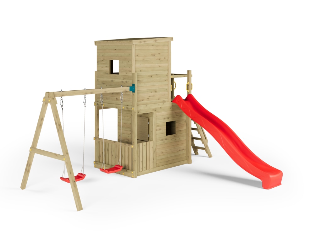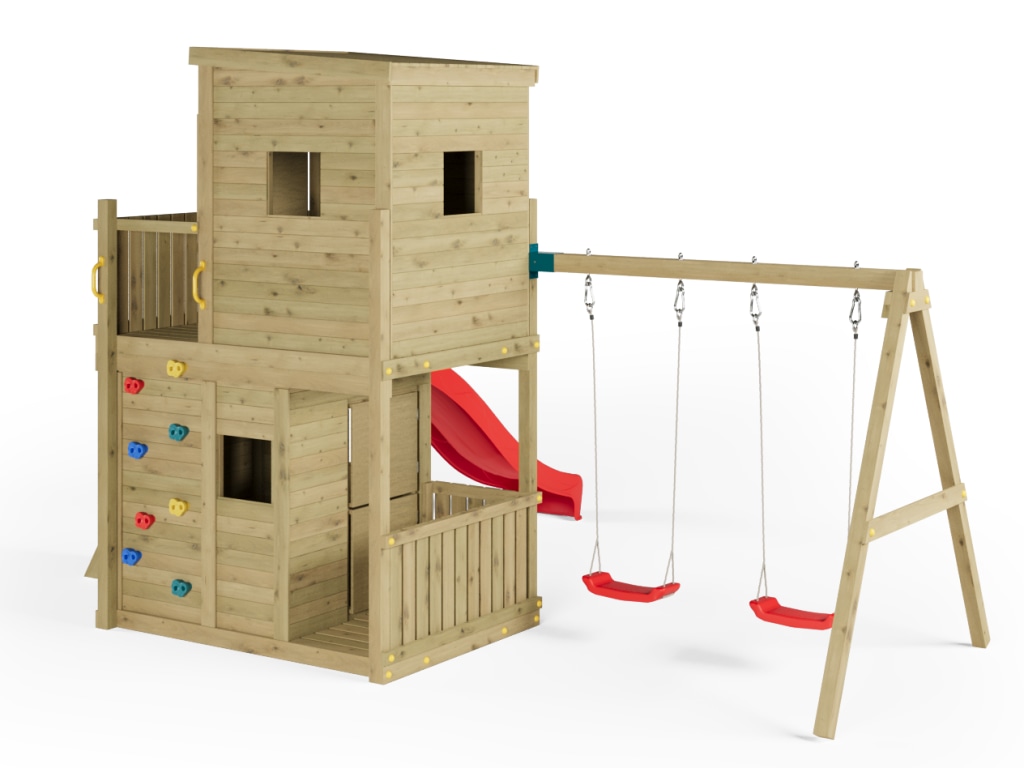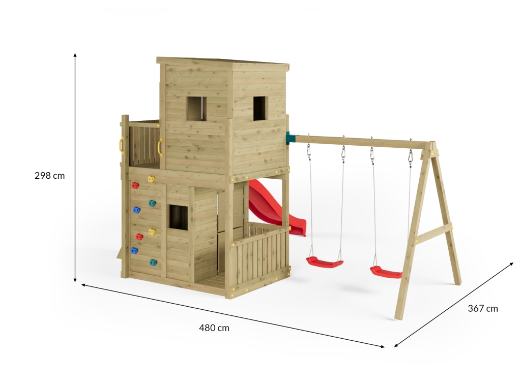 Material: Holz, B x T x H: 480 x 367 x 298 cm, inkl. Doppelschaukel + Kletterwand, inkl. Rutsche rot