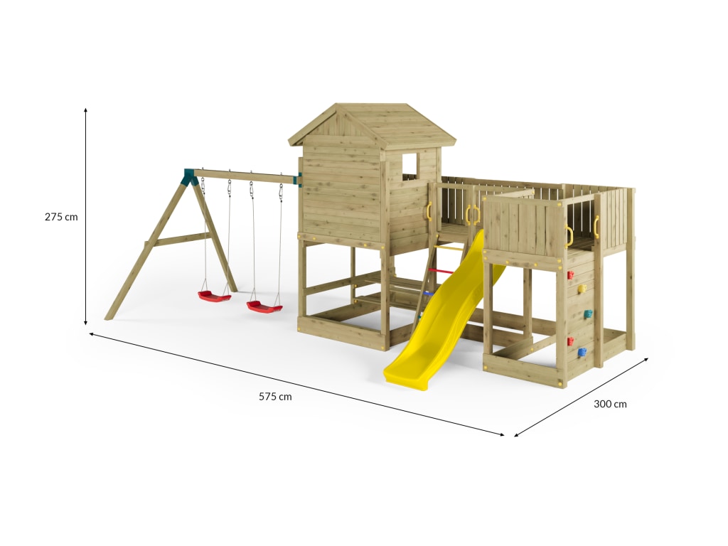 Material: Holz, B x T x H: 575 x 300 x 275 cm, Doppelschaukel + Kletterwand + Picknick-Tisch, inkl. Rutsche gelb