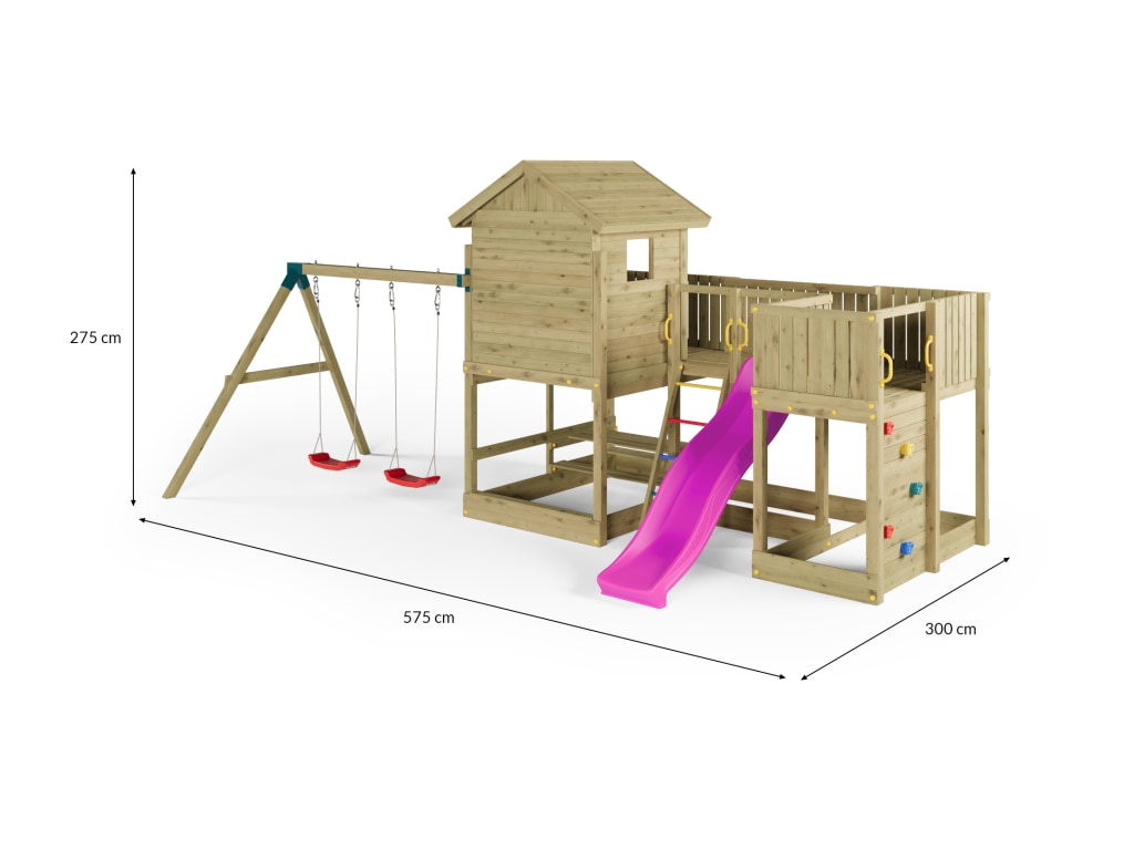Material: Holz, B x T x H: 575 x 300 x 275 cm, Doppelschaukel + Kletterwand + Picknick-Tisch, inkl. Rutsche pink
