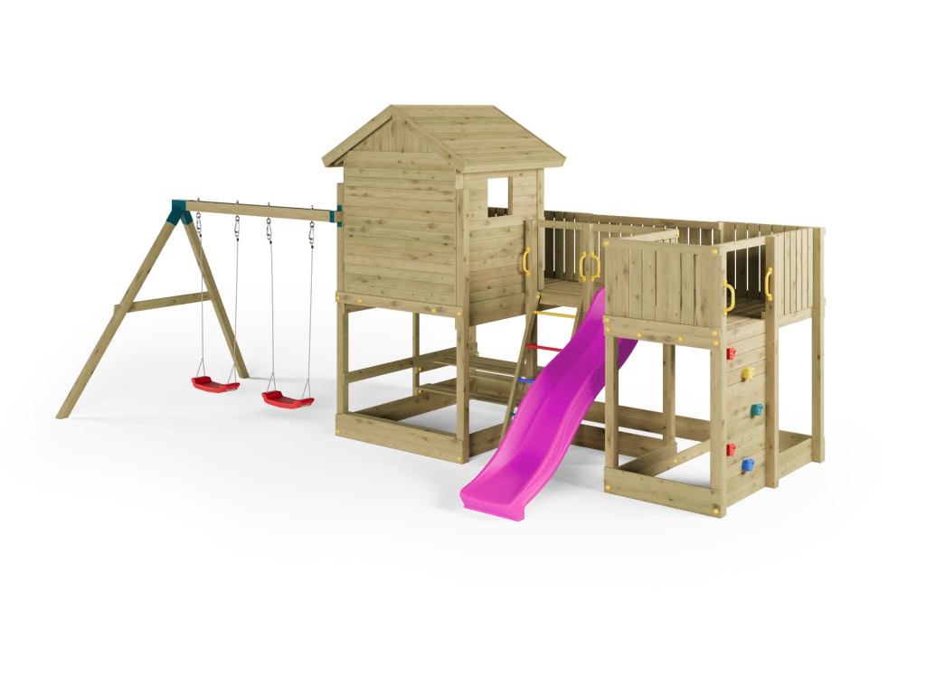 - Stelzenhaus, 6x Haltegriff, 6x Bodenanker, 2x Schaukelsitz rot, 5 bunte Klettersteine, Picknicktisch, Rutsche pink