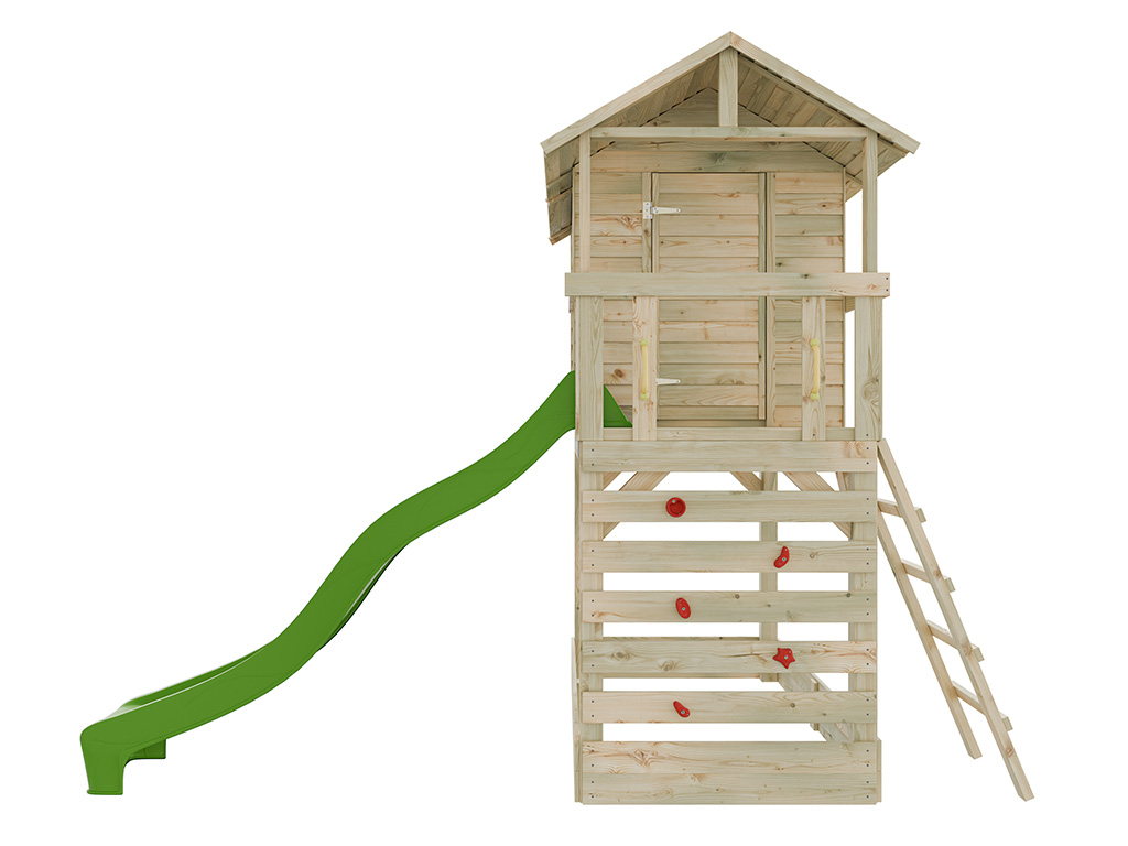 Im Lieferumfang ist eine schräge Leiter für einen sicheren Aufstieg enthalten. Für zusätzlichen Spielspaß ist das Stelzenhaus mit einer Kletterwand und 5 roten Klettersteinen ausgestattet. - Inkl. Rutsche