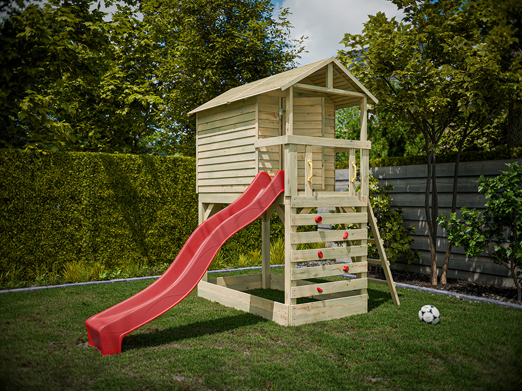 Im Lieferumfang ist eine schräge Leiter für einen sicheren Aufstieg enthalten. Für zusätzlichen Spielspaß ist das Stelzenhaus mit einer Kletterwand und 5 roten Klettersteinen ausgestattet. - Inkl. Rutsche