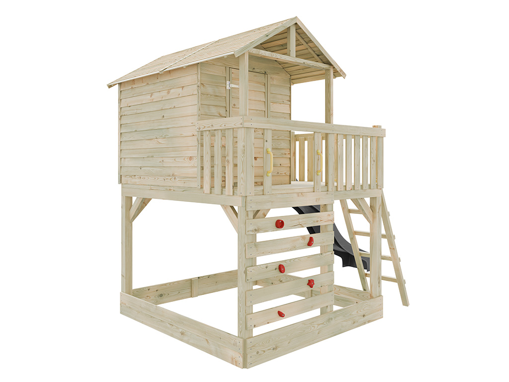 Im Lieferumfang ist eine schräge Leiter für einen sicheren Aufstieg enthalten. Für zusätzlichen Spielspaß ist das Stelzenhaus mit einer Kletterwand und 5 roten Klettersteinen ausgestattet.