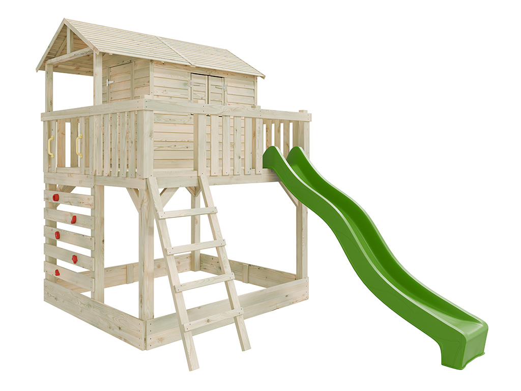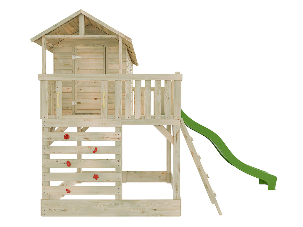Im Lieferumfang ist eine schräge Leiter für einen sicheren Aufstieg enthalten. Für zusätzlichen Spielspaß ist das Stelzenhaus mit einer Kletterwand und 5 roten Klettersteinen ausgestattet. - Inkl. Rutsche