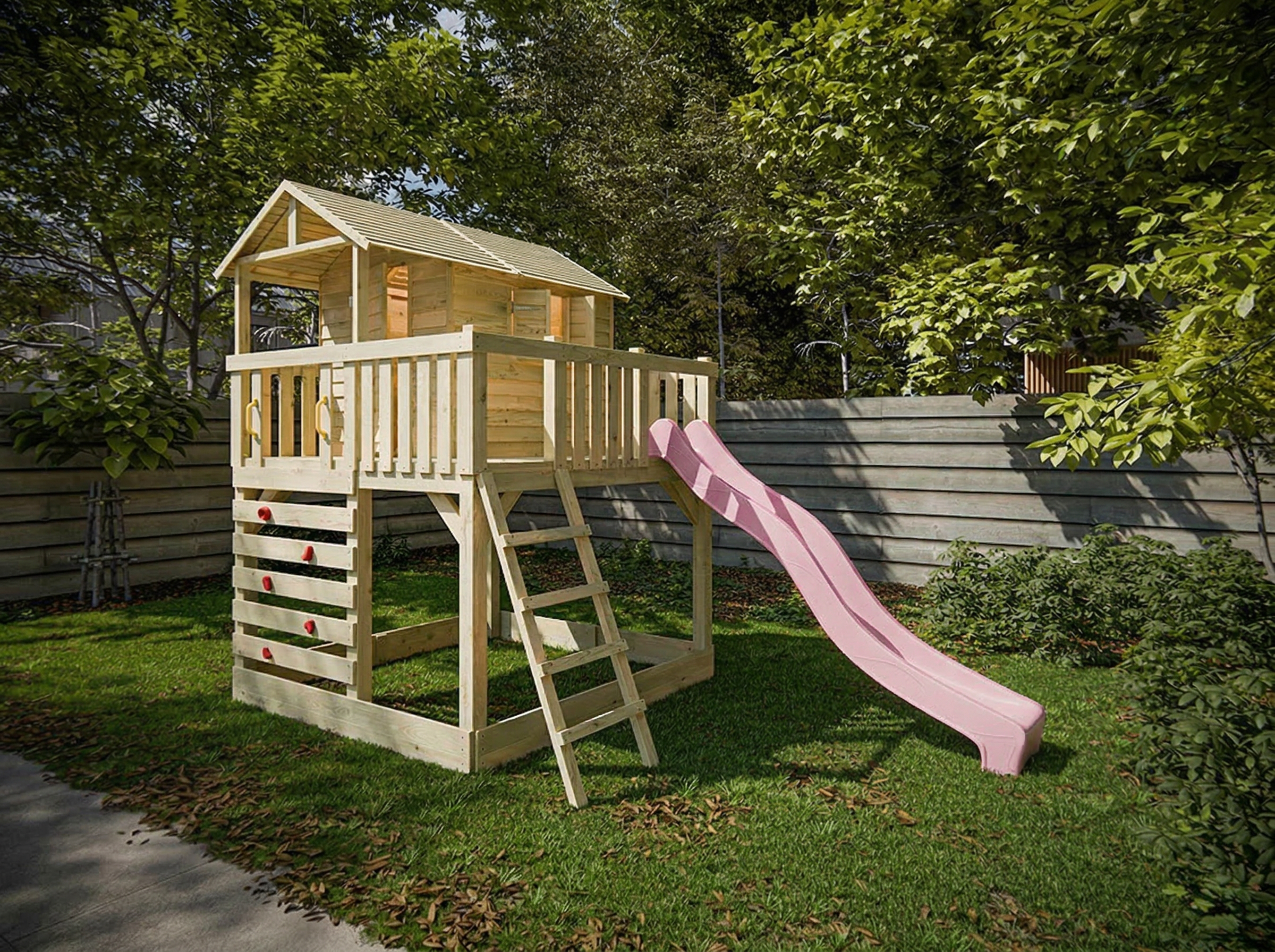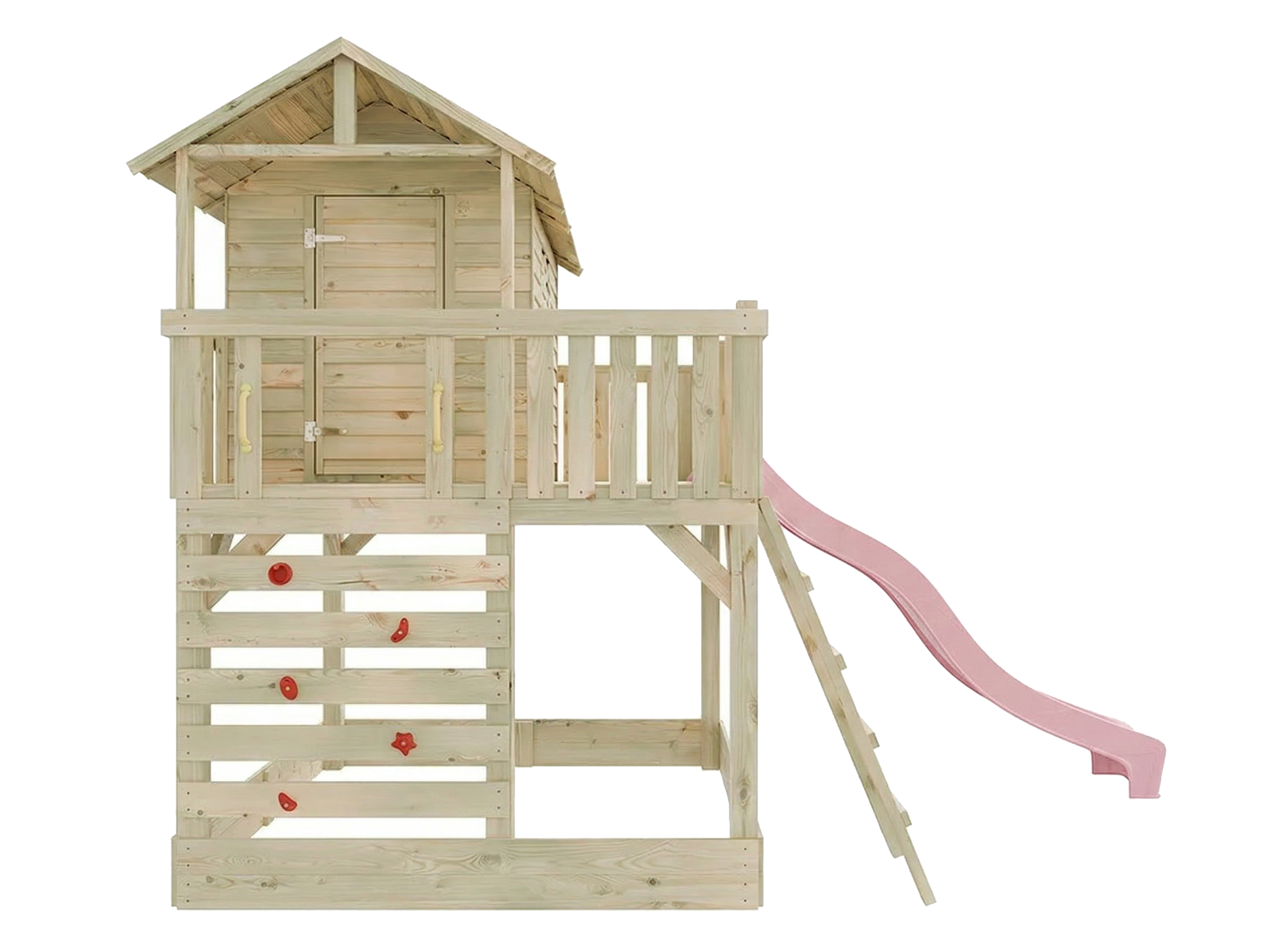 Im Lieferumfang ist eine schräge Leiter für einen sicheren Aufstieg enthalten. Für zusätzlichen Spielspaß ist das Stelzenhaus mit einer Kletterwand und 5 roten Klettersteinen ausgestattet. - Inkl. Rutsche