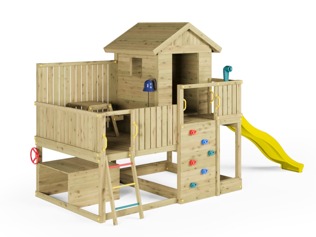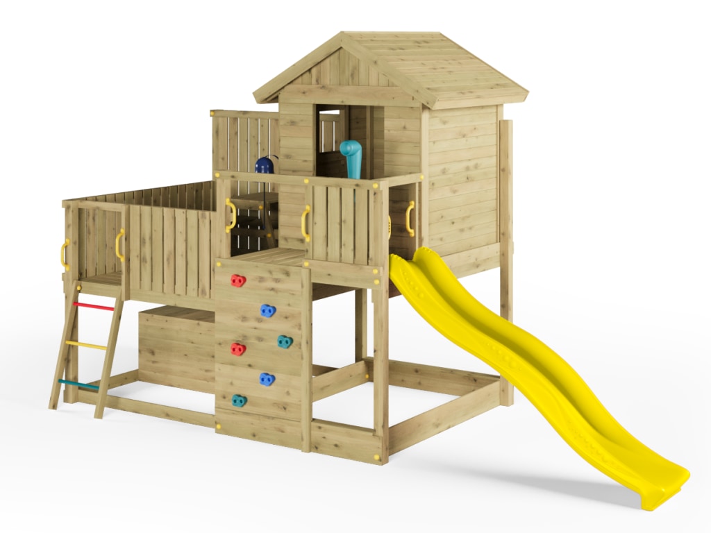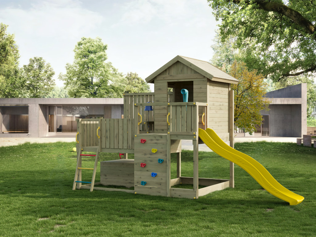 Material: Holz, B x T x H: 461 x 208 x 275 cm, inkl. Kletterwand + Picknick-Tisch + Toy-Box, inkl. Zubehör + Rutsche gelb