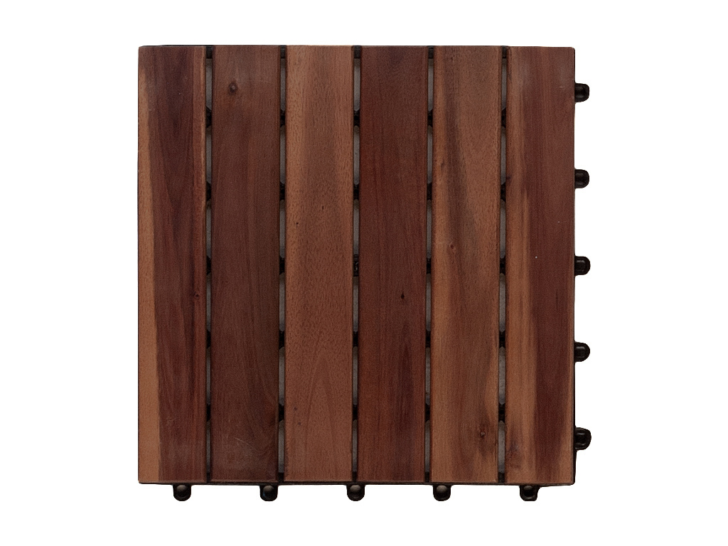 Diese 24 mm starken Terrassenfliesen werden aus Akazie hergestellt. Das gold- bis olivbraune Hartholz der Akazie besticht mit seiner glatten Oberfläche und der lebhaften Maserung durch ausgeprägte Jahresringe und Streifenzeichnung sowie mit robusten und wetterfesten Eigenschaften. Es ist sehr biegsam und verfügt nur über geringeres Quell- und Schwindverhalten, sodass es kaum zu Rissbildungen kommt und das Holz leicht zu verarbeiten ist. Eine Behandlung mit Holzschutzmitteln schützt vor Sonneneinstrahlung.