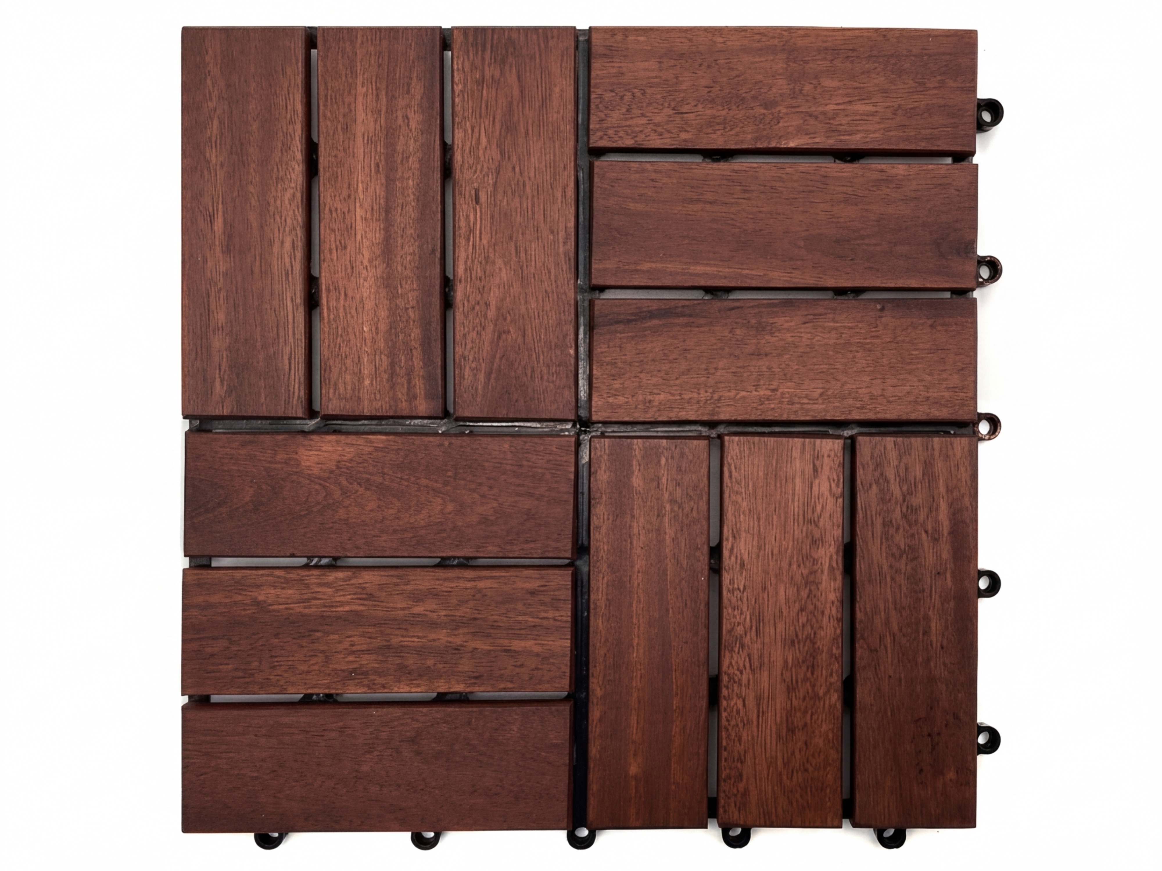 Terrassenfliese Akazie dunkel geöltohne Schrauben, 6 Latten Optik, 30 x 30 cm, 24 mm stark, PVC-Träger