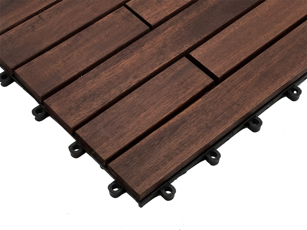 Terrassenfliese Akazie dunkel geöltohne Schrauben, 6 Latten Optik, 30 x 30 cm, 24 mm stark, PVC-Träger