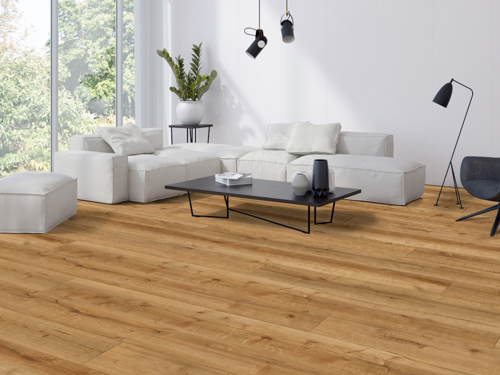 Die typische Eichenholz-Maserung des Dekors strahlt zeitlose Klasse und behagliche Wärme aus. Landhausdielen sind perfekt für alle, die den authentischen Holzcharakter ihres Bodens hervorheben möchten – für ein rustikales Flair. Mit seiner natürlichen Maserung ist dieser Boden der ideale Partner für nahezu jeden Wohntrend. Die an vier Seiten umlaufende Fase strukturiert das Verlegebild und verleiht ihm ein gleichmäßiges Muster. Die strukturierte Oberfläche orientiert sich an der Maserung und verleiht der Diele zusätzlich eine haptische Komponente.