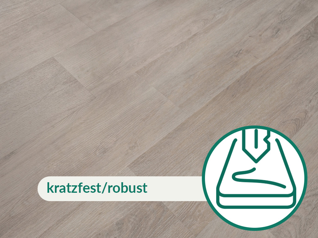 Mit seinen 0,3 mm Nutzschicht ist der Boden gut gewappnet für die Beanspruchung in Wohn- und Kinderzimmer oder Flur. Er entspricht der Nutzungsklasse 22 und ist somit mittelmäßig beanspruchte Räume im privaten Bereich wie Küchen, Schlafzimmer Bad oder Wohnzimmer geeignet. Mit der gewerblichen Nutzungsklasse (NK) 31 eignet er sich ebenso für leichte Beanspruchung wie in Kleinbüros oder Konferenzräumen.