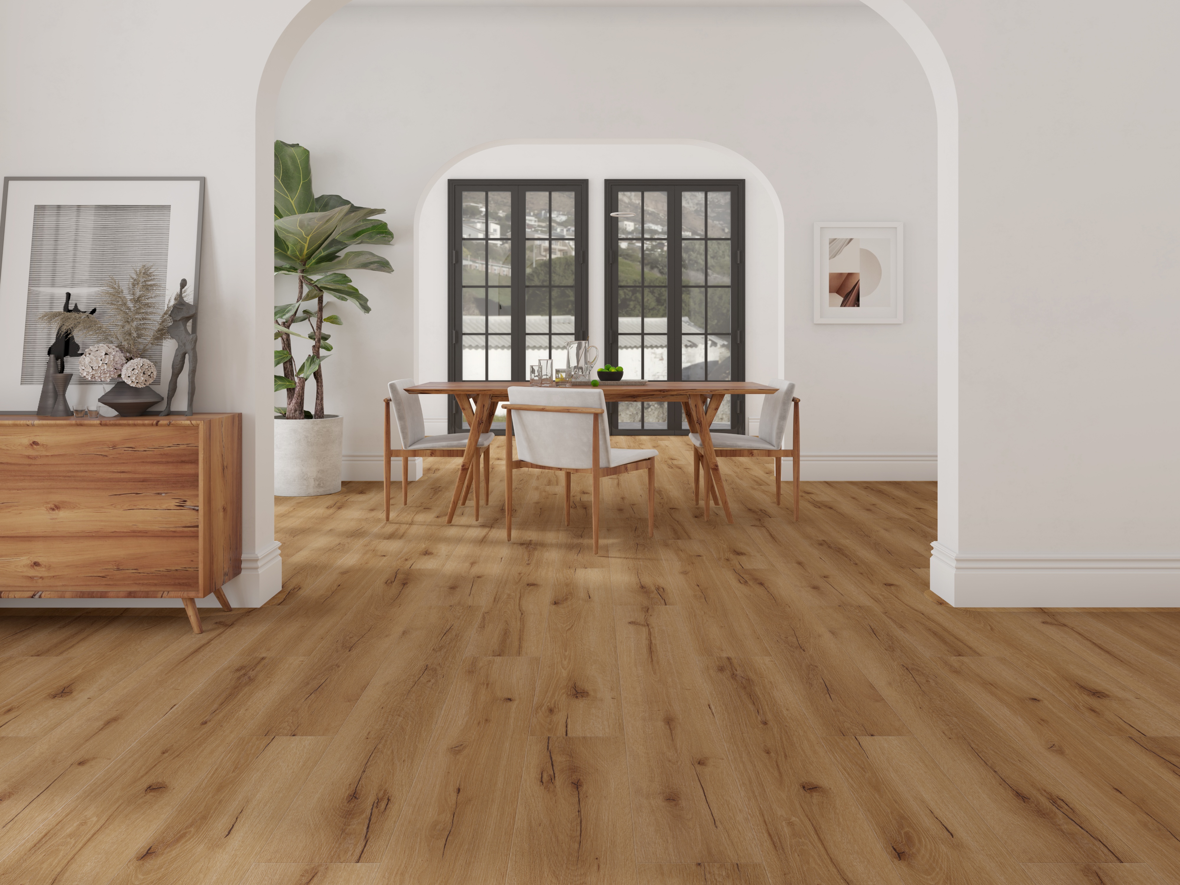 Das Dekor in authentischer Eichenholzoptik vermittelt fühlbare Wärme und Behaglichkeit. Landhausdielen besitzen mit ihrer Ein-Stab-Optik einen natürlichen und rustikalen Look, der jeden Raum gemütlich wirken lässt. Die fugenlose Optik des Bodens trägt zu einem glatten, einheitlichen und harmonischen Verlegbild bei. Dank der feinen und realistisch wirkenden Porenstruktur entsteht eine vielfältige Oberflächendynamik.
