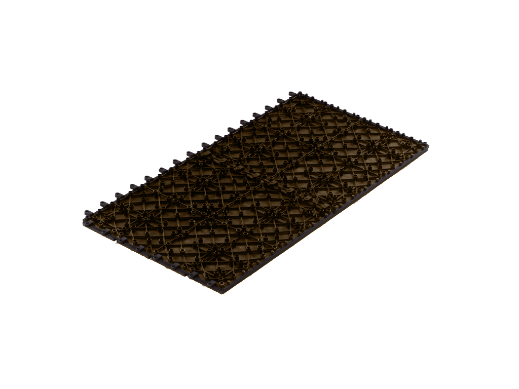 Dank des Klicksystems lässt sich der Boden sehr leicht verlegen und ebenso wieder demontieren. Die Fliesen sind auf einem Trägerrost aus Kunststoff befestigt und werden nur zusammengesteckt.