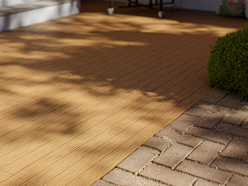 Bei mono-extrudierten WPC-Terrassenfliesen werden die Dielen in einem speziellen Extrusionsverfahren gefertigt und durchgängig in der Masse gefärbt. Dadurch entsteht eine homogene Struktur mit einer natürlichen Optik, die echtem Rohholz täuschend ähnlich sieht. Gleichzeitig bietet dieses Verfahren eine hohe Formstabilität sowie Widerstandsfähigkeit gegenüber Feuchtigkeit und Temperaturschwankungen.