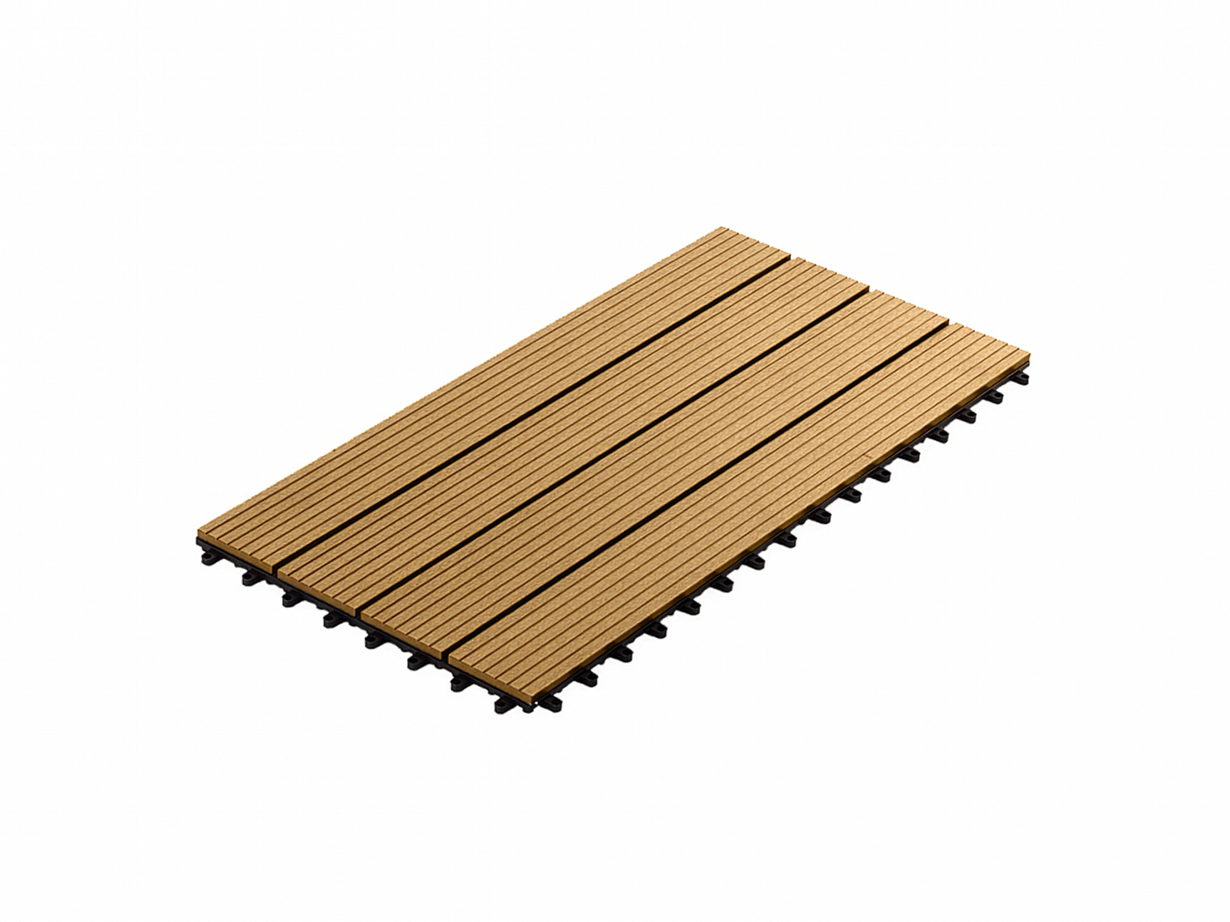Diese 21 mm starken Terrassenfliesen werden aus WPC hergestellt. WPC (Wood Plastic Composite) ist eine Verbindung aus ca. 70 % Holz und 30 % Kunststoff mit vielen Vorteilen. Dieser Verbundwerkstoff ist nicht nur leicht zu pflegen und reinigen, sondern auch witterungsbeständig, form- und farbstabil, splitterfrei sowie rutschfest – der ideale Terrassenbelag. Außerdem zeichnet er sich durch die hohe Dichte aus, die ihn gut vor Insektenbefall schützt.